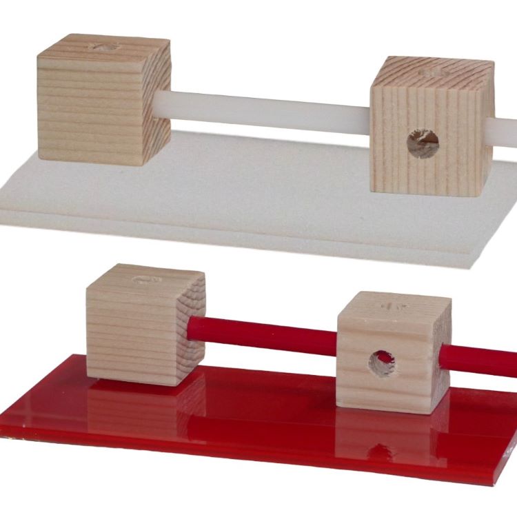De gauche à droite : Socle noir, granité, transparent double étage, rouge.